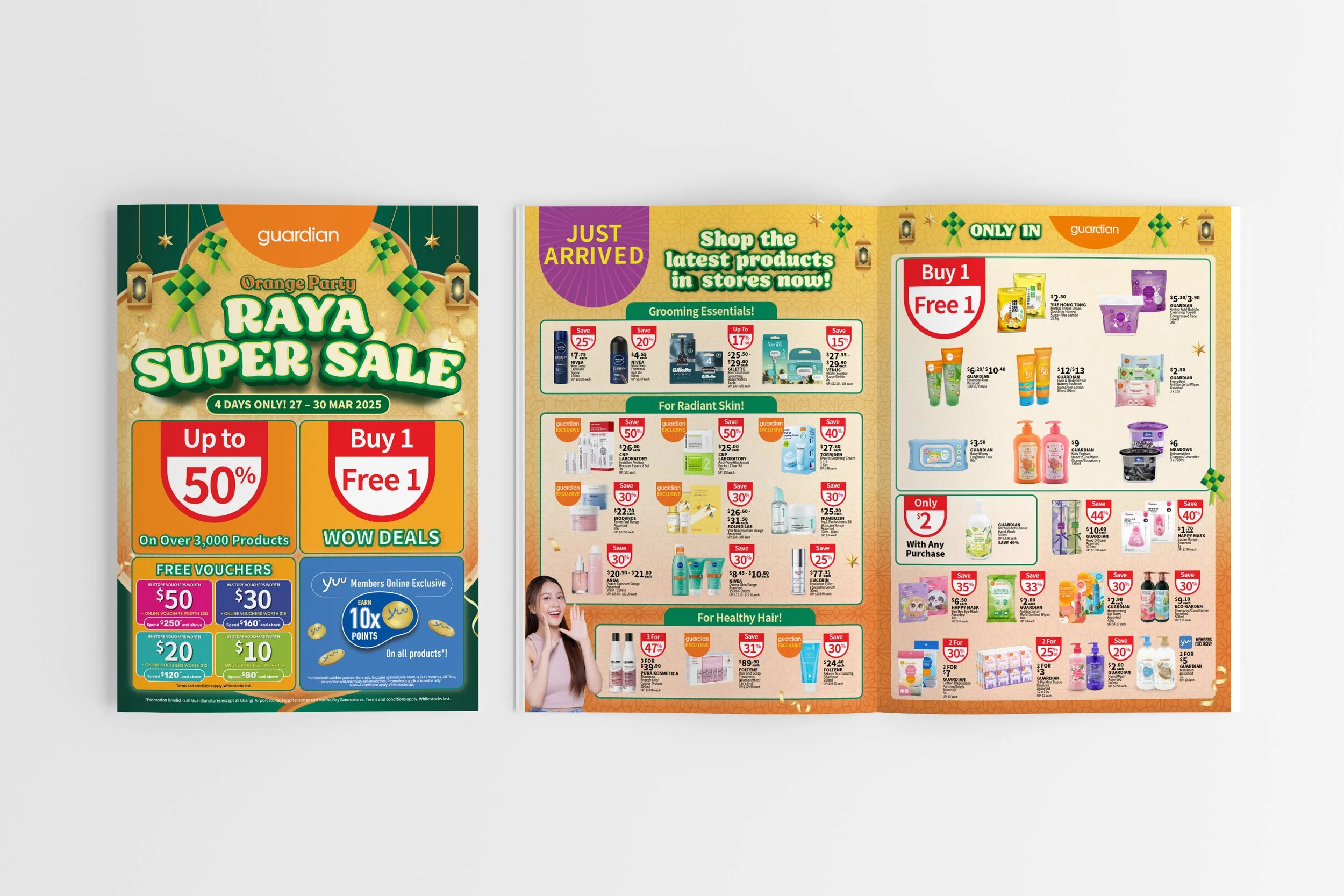 Orange Party is a bi-monthly sales campaign run by Guardian. I was tasked with developing the creative vision for the covers, which set the theme and a cohesive overall look for the campaign, while ensuring consistency with Guardian’s brand identity. Our team of four collaborated on filling in the product listings, and I took turns with another teammate to handle the digital and physical adaptations for each campaign.