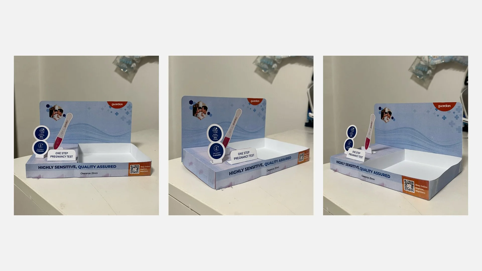 I was tasked to create a top shelf display for Guardian’s pregnancy test kits. I conducted visual market research through in-store observations and online research to inform my design. I started with sketching out on paper then creating the design in illustrator and doing a mockup in photoshop before test printing a small scale of the design in paper.